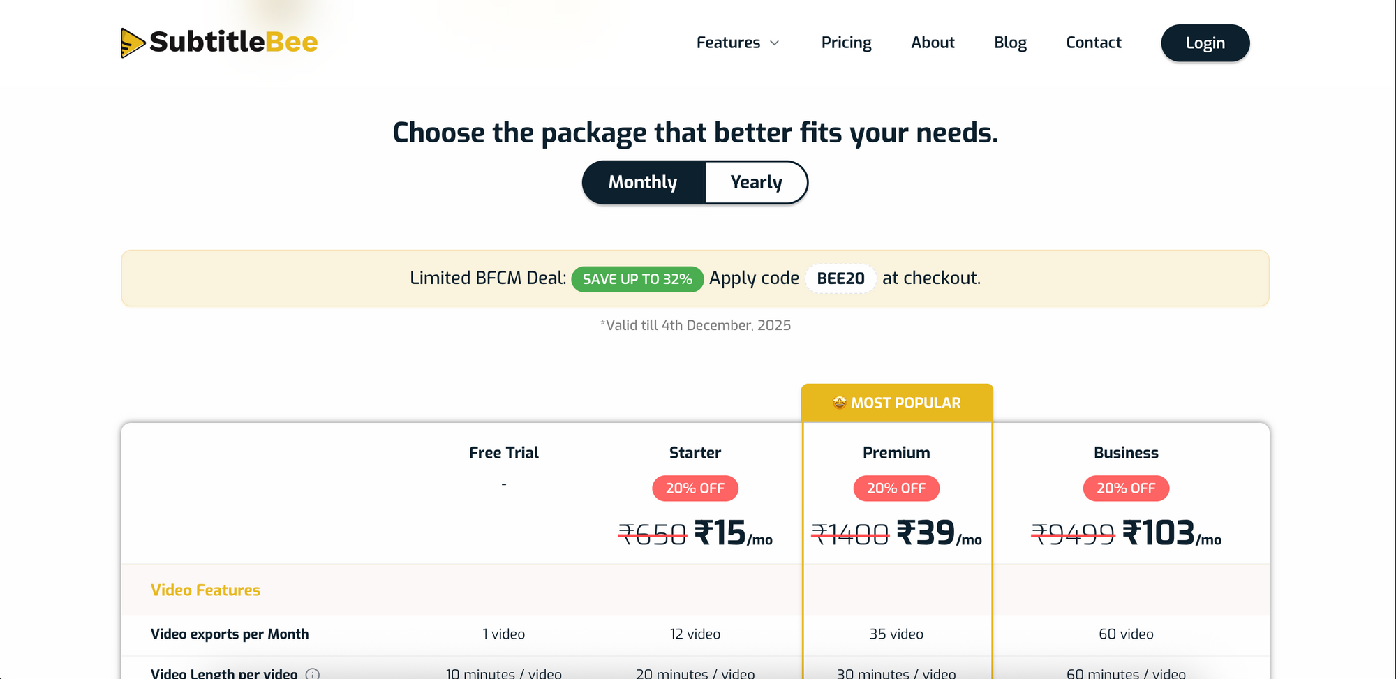 How to Redeem the Deal: Visit the SubtitleBee website, choose your preferred monthly or yearly plan, and apply the code BEE20 at checkout to unlock your exclusive Black Friday discount.