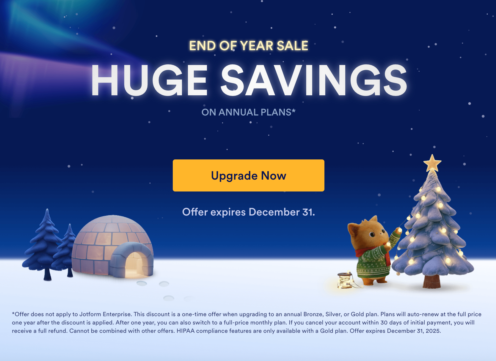 Verdict: Best for teams handling onboarding forms, applications, feedback, event registrations, or payment forms. If you’re planning to upgrade yearly, this one-time holiday pricing lets you lock in Jotform at a lower cost for the first year.