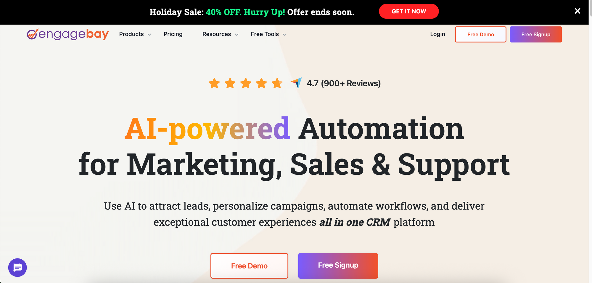 EngageBay is a unified CRM platform that brings marketing automation, sales pipelines, and customer support into one place. From email campaigns and lead generation to deal tracking and helpdesk management, it helps businesses nurture leads and convert them without juggling multiple tools.