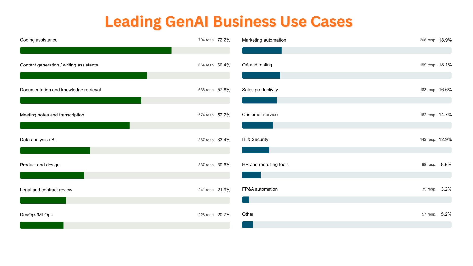Recent data on leading business AI use cases shows that AI is most widely applied in coding assistance, writing support, knowledge retrieval, and meeting transcription. High-impact use cases but largely individual productivity layers.
