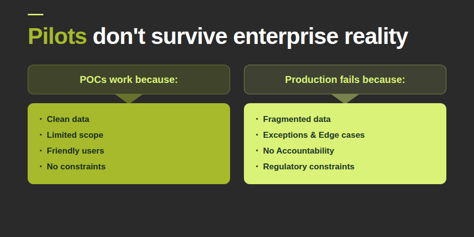 Most AI initiatives fail because they never integrate into actual work. Lack of governance, unclear ownership, poor data readiness, and weak workflow integration prevent technically strong AI models from creating lasting business value.