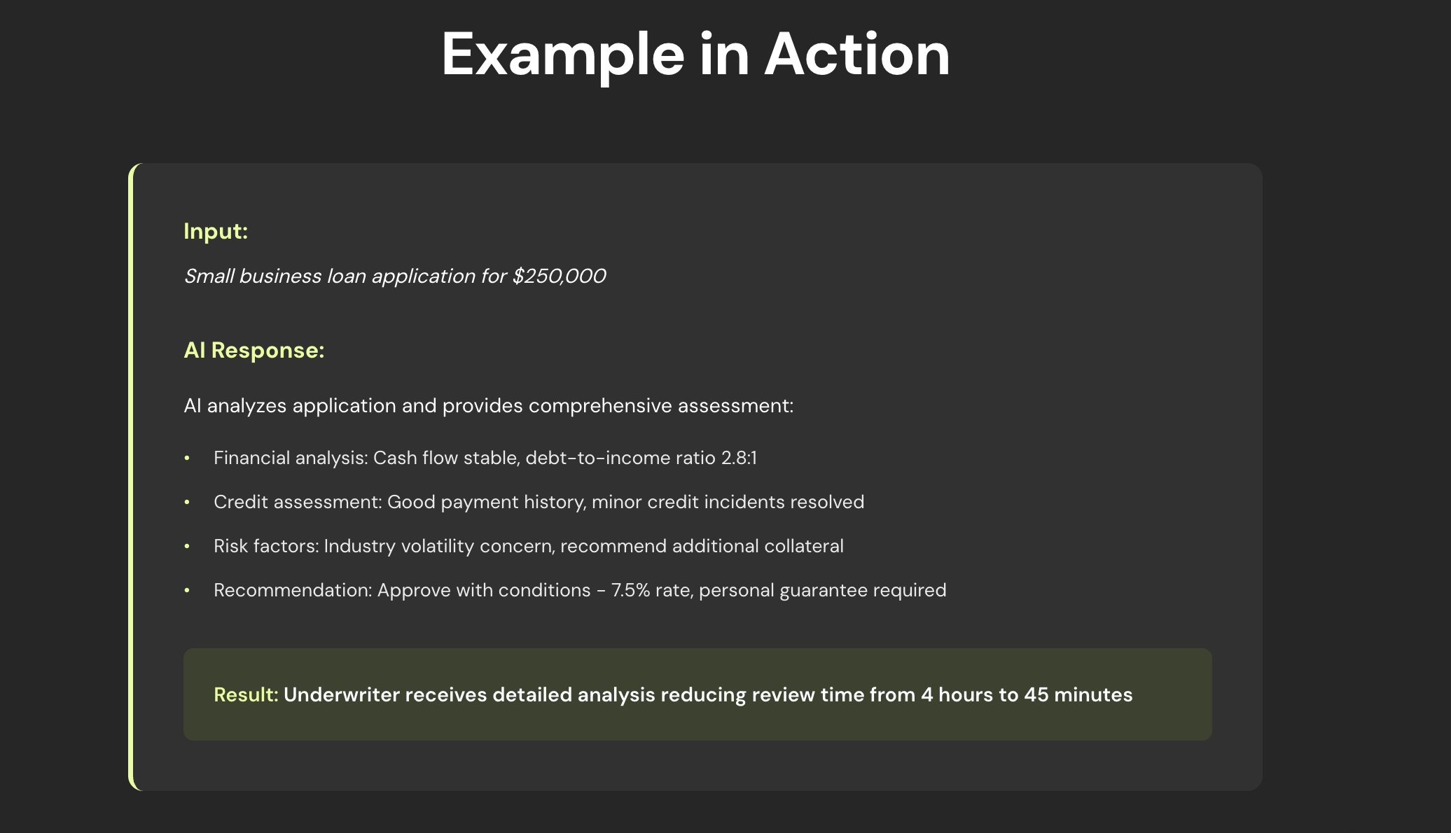 - For example, Gyde’s Loan Underwriting Co-Pilot works in the flow of underwriting; guiding users as they review loan applications by automatically extracting financial data, highlighting risk indicators, and presenting clear recommendations without requiring them to switch systems or run manual checks.