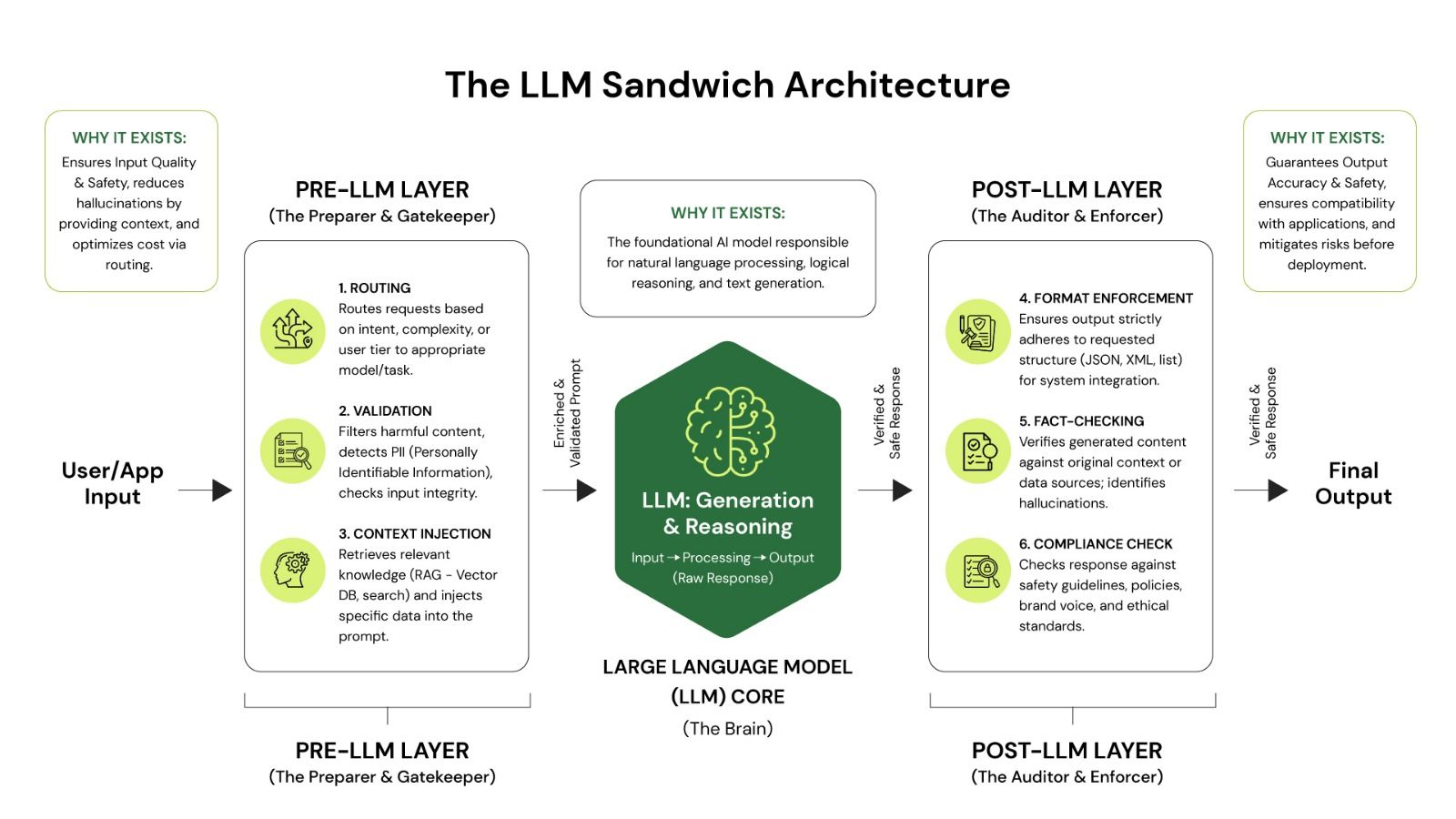 Why a "sandwich"? The AI(LLM) is the filling: the intelligent, reasoning part. The pre- and post-processing layers are two sides of bread. Without bread, the filling goes everywhere. With it, you have something structured, useful, and safe to deliver.